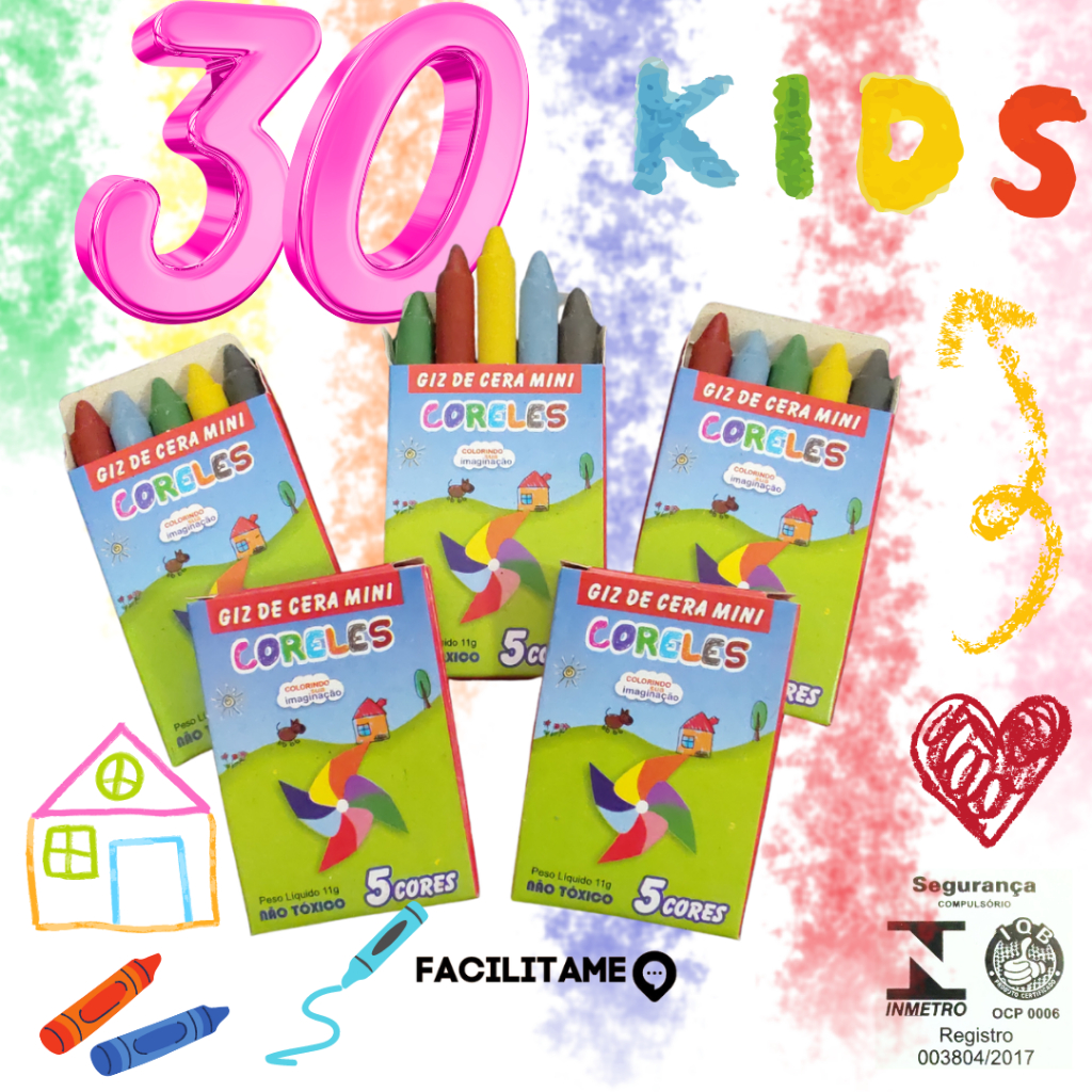 30 Caixa Mini Giz de Cera 5 Cores P/ Kit Festa Lembrancinha Infantil