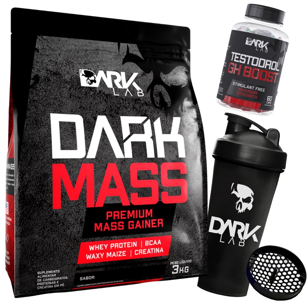 Hipercalorico Dark Mass 3kg Premium Mass Gainer Protein, BCAA, Creatina, Waxy Maize + Testodrol-Gh Boost 60 Caps + Coqueteleira para Shaker Dark Lab