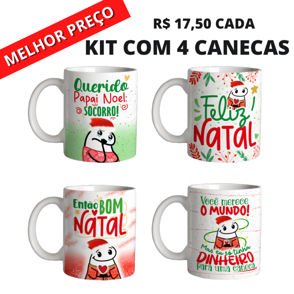 Canecas de Natal Flork Personalizada de Porcelana Kit 4 unidades Ideal para Cesta Presente