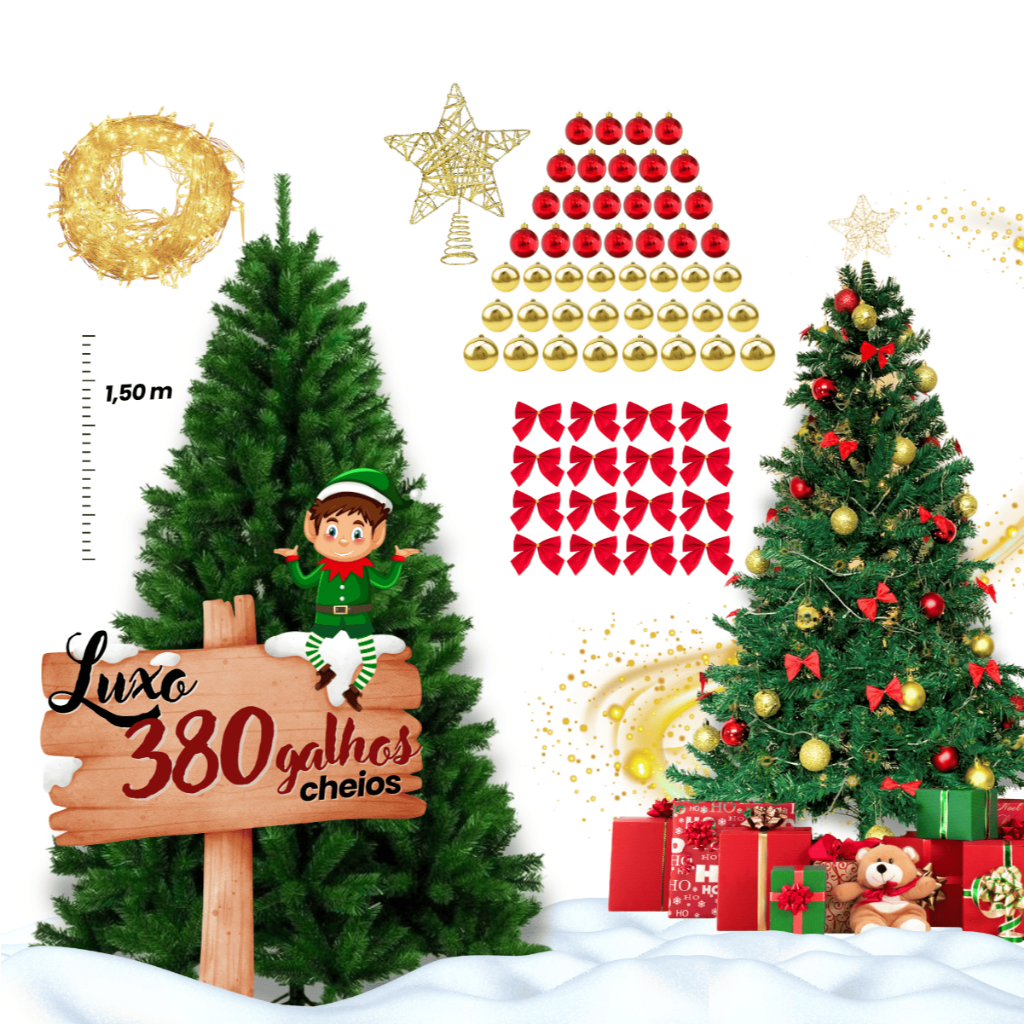 Árvore de Natal Luxo 1,5m com 380 Galhos Decorada com 82 Enfeites Pinheirinho Verde Tradicional é de Ferro Pinheiro Real