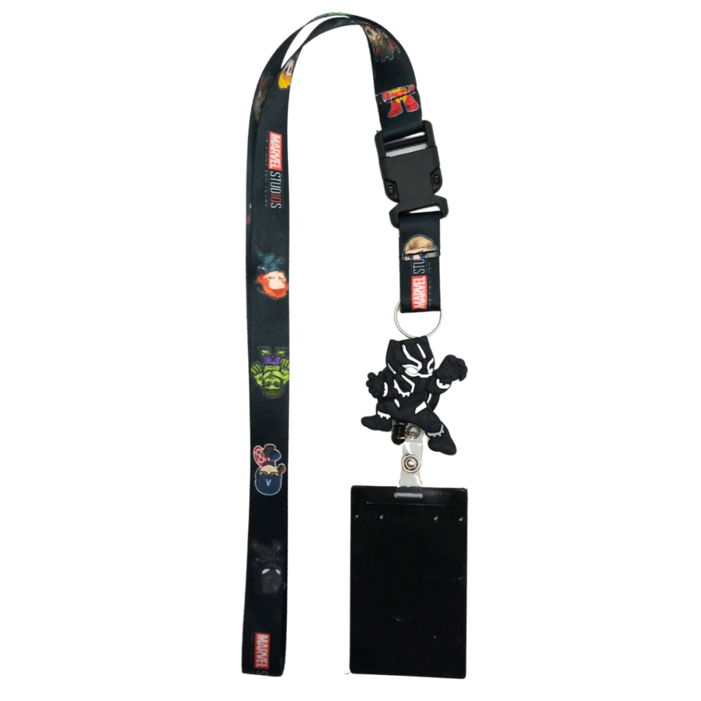 Kit Cordão Pescoço com Fecho Engate Rápido Heróis + Porta Crachá Retrátil Pantera Negra + Porta Cartão Preto
