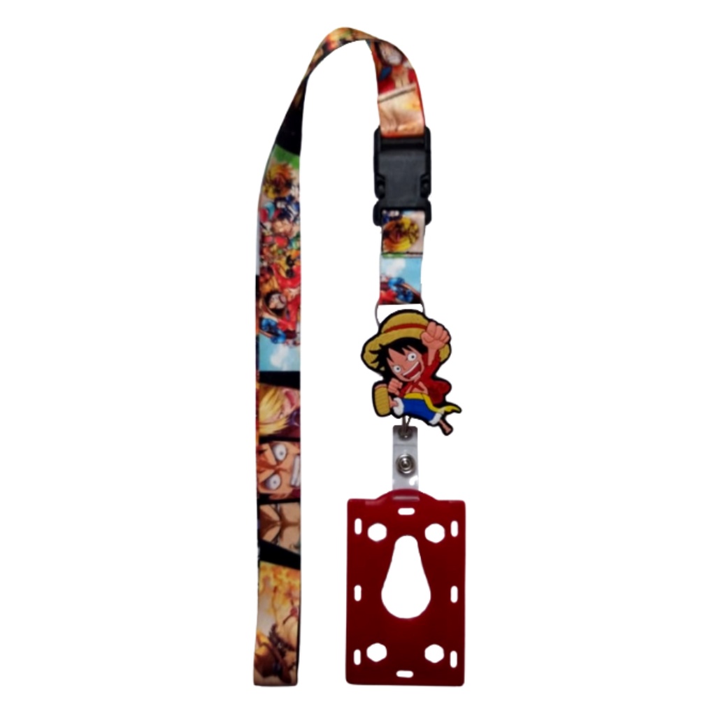 Kit Cordão One Piece com Fecho Engate Rápido + Porta Crachá Retrátil Luffy Pulando + Porta Cartão Vermelho
