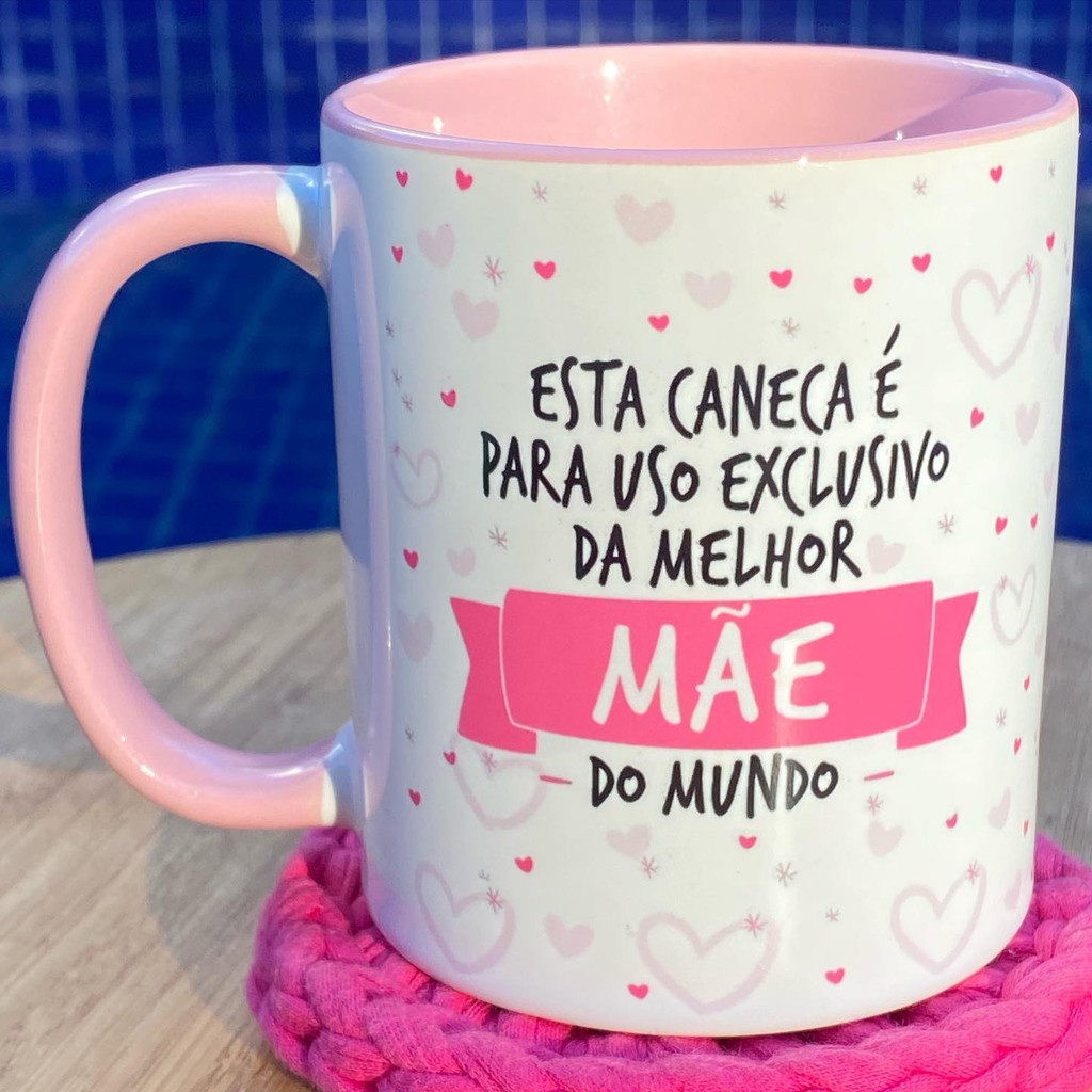 Caneca personalizada USO EXCLUSIVO DA MELHOR MÃE DO MUNDO + te amo mãe (cerâmica branca 325 mL) - interior e alça rosa - dia das mães - XÍCARA