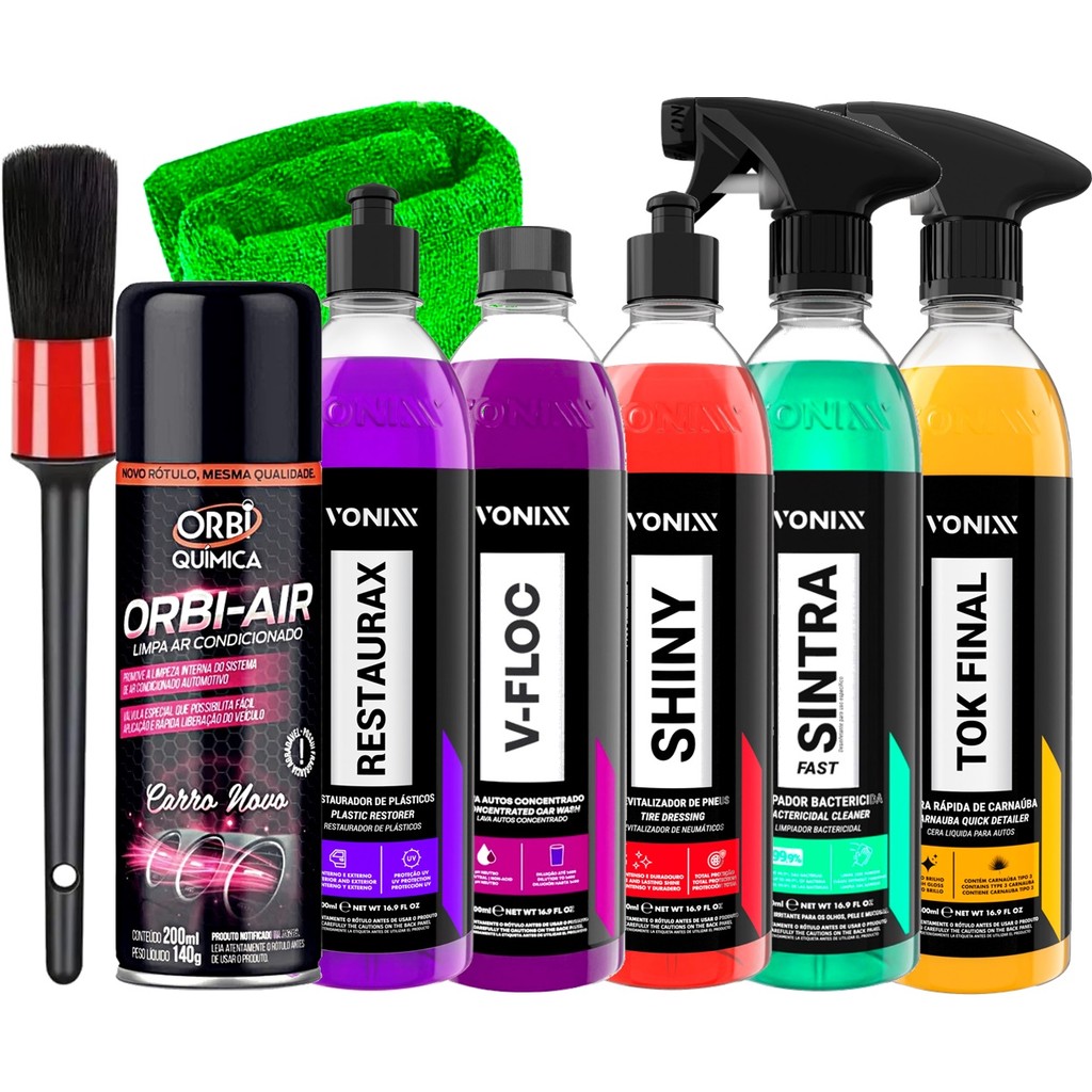 Kit Completo Limpeza Automotiva Vonixx Lavagem de Carro Moto Higicouro Hidracouro Sintra Intense Cera Tok Final V-floc Pincel Toalhas Luva e Aplicador