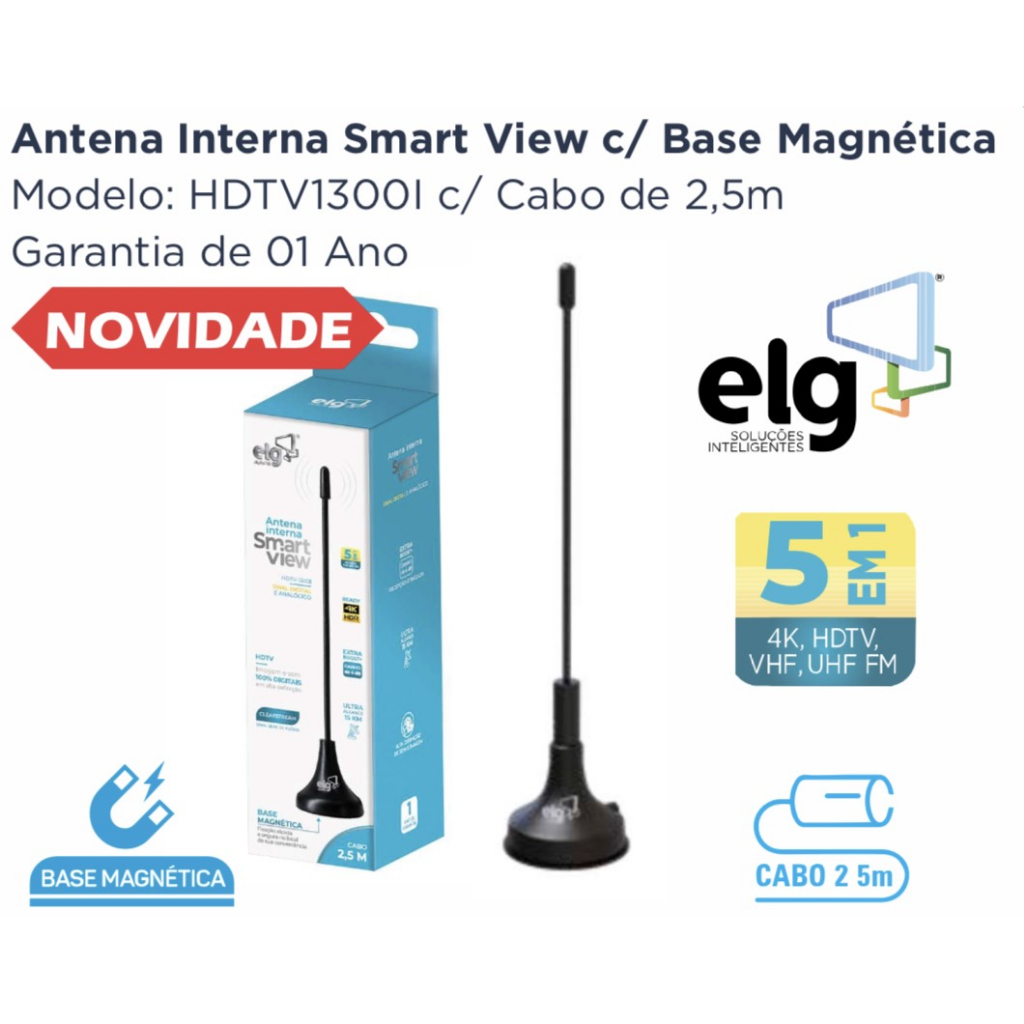 Antena de TV Digital e Analógica Interna 5 em 1 c/ Base Magnética e Cabo de 2,5m com Ganho de até 15km na qualidade do sinal - Marca ELG com Garantia de 1 ano