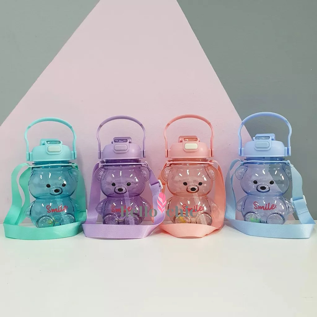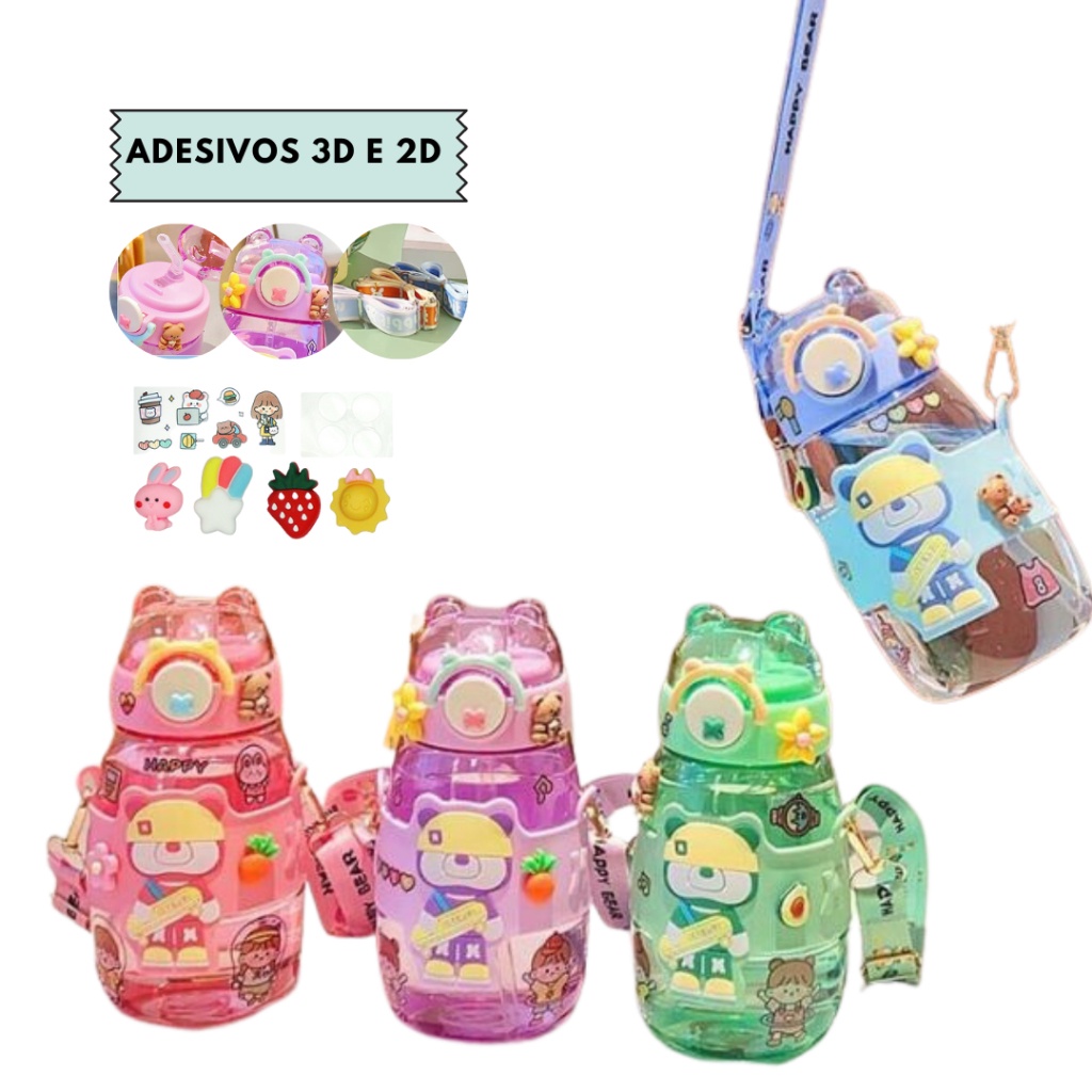 Garrafa De Agua Infantil Ursinho Fofo Smile 1000ml Alça com Canudo e Alça 3D ADESIVOS