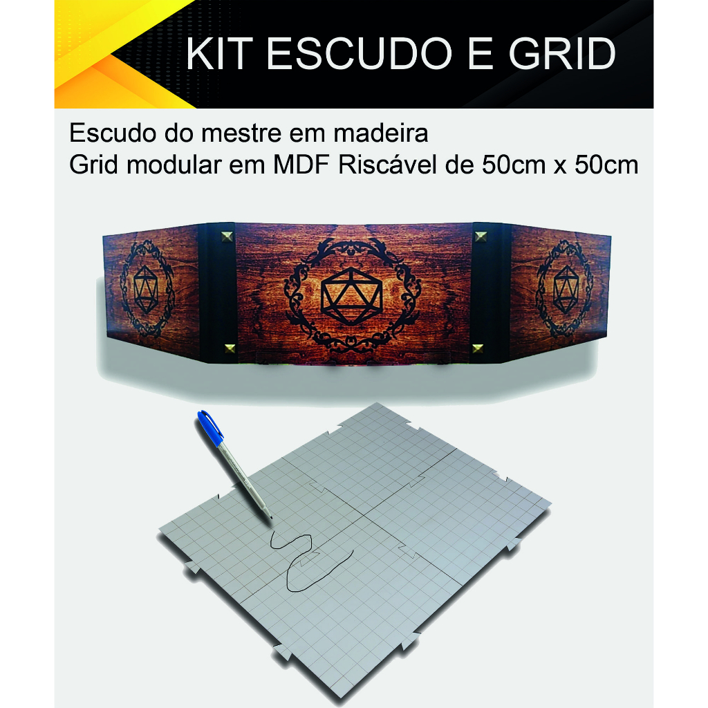 Kit RPG : Escudo do mestre em madeira + Grid modular Riscável em madeira de 50cm x 50cm.
