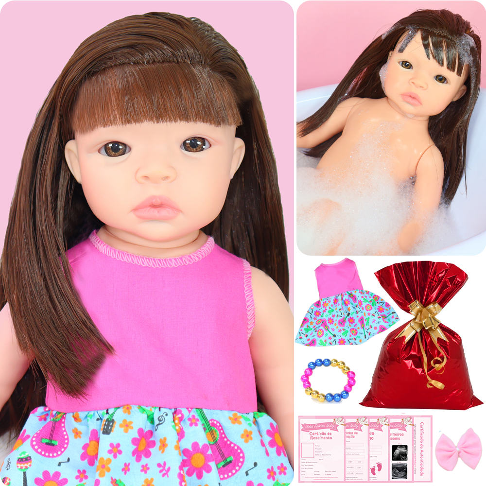 Boneca Silicone Menina Realista Bebe Reborn Eloise Cabelo Castanho Vestidinho Recem Nascido Baby Com Acessorios