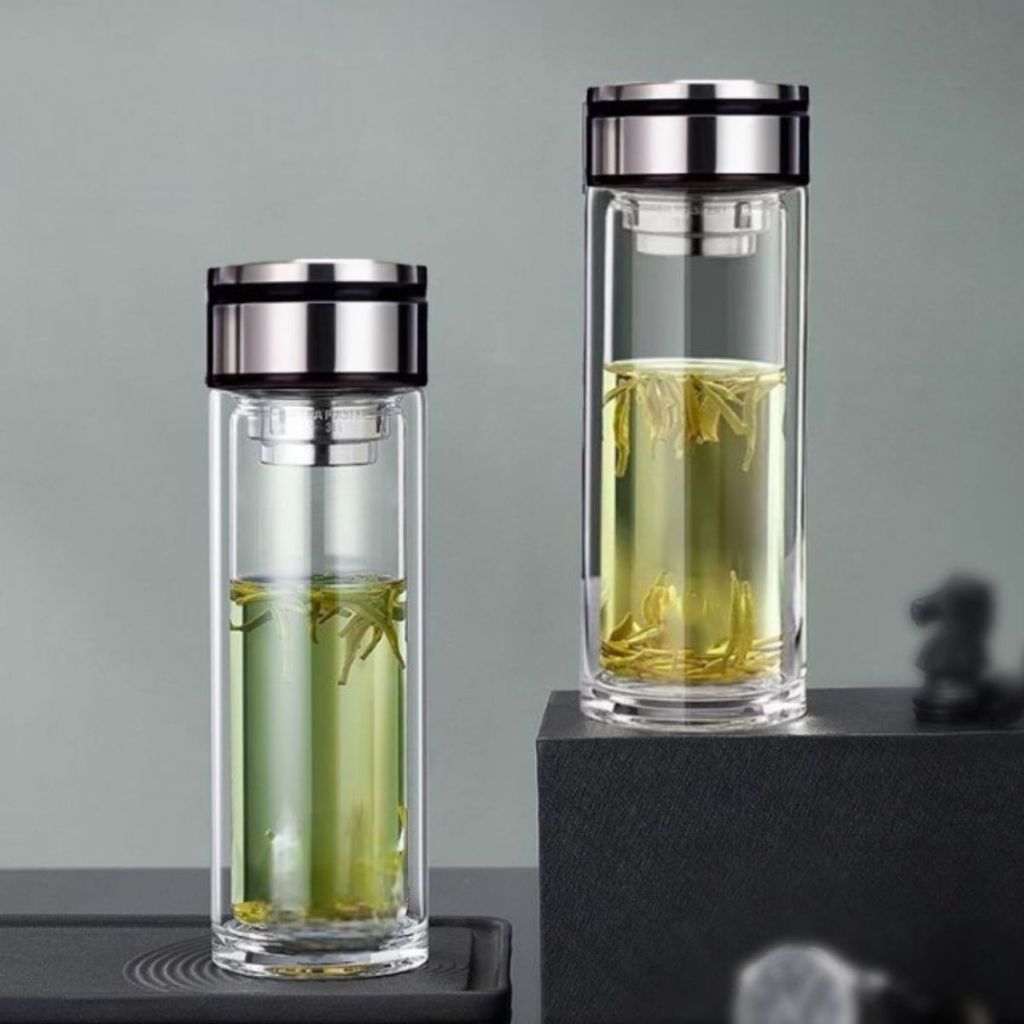 Kit 2 Garrafa de Vidro Copo Com Infusor de Chá em Inox Camada Dupla Com Isolamento Térmico Copo Resistente a Alta Temperatura 400ml - 2 Unidades