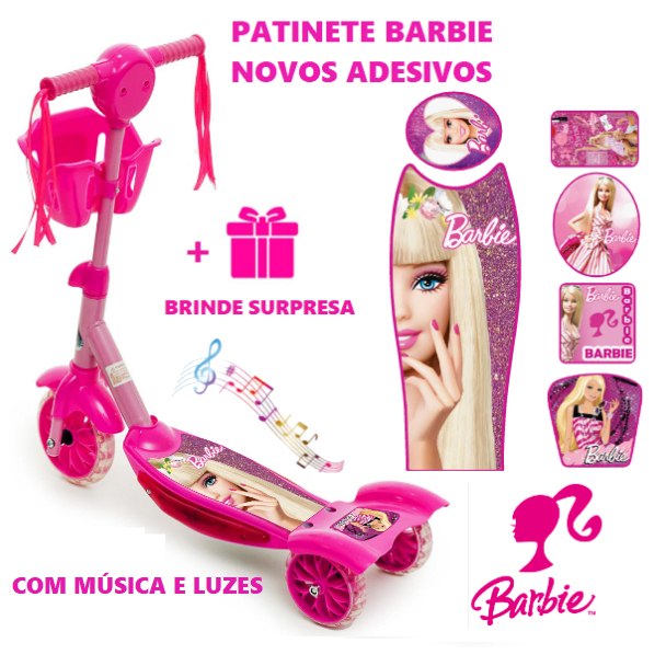 Patinete Infantil Barbie Musical Rosa Lilás Menina 3 Rodas Com Luzes Freio Cestinha Altura Ajustável