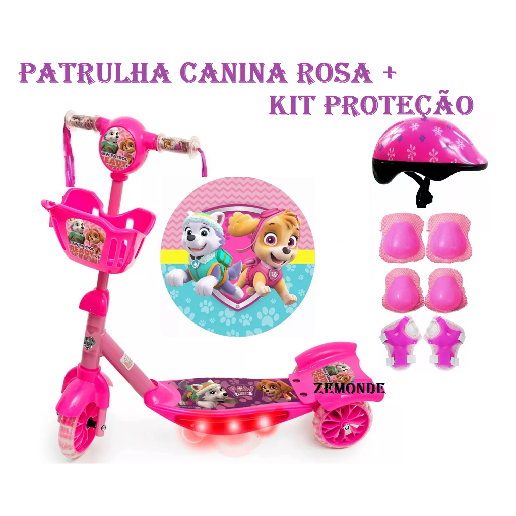 Patinete Infantil Patrulha Canina Sky Rosa Musical Patinete Menina 3 Rodas Cesta e Luz Promoção