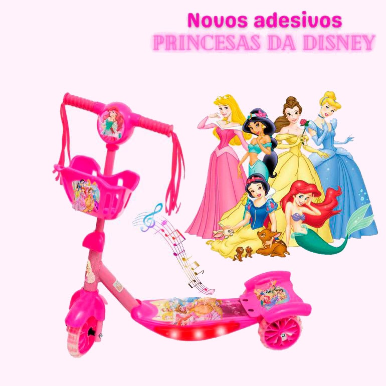 Patinete Infantil Menina 3 Rodas Rosa Princesas Disney Lançamento Musical e Luzes