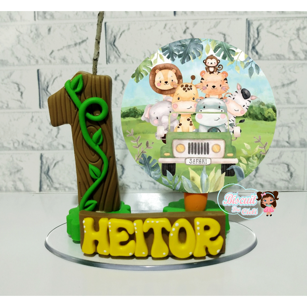 Vela de aniversário Safari Cenário biscuit 1, 2 , 3 ,4 , 5 , 6 , 7 , 8 ,9 , 10 topo de bolo Cenário