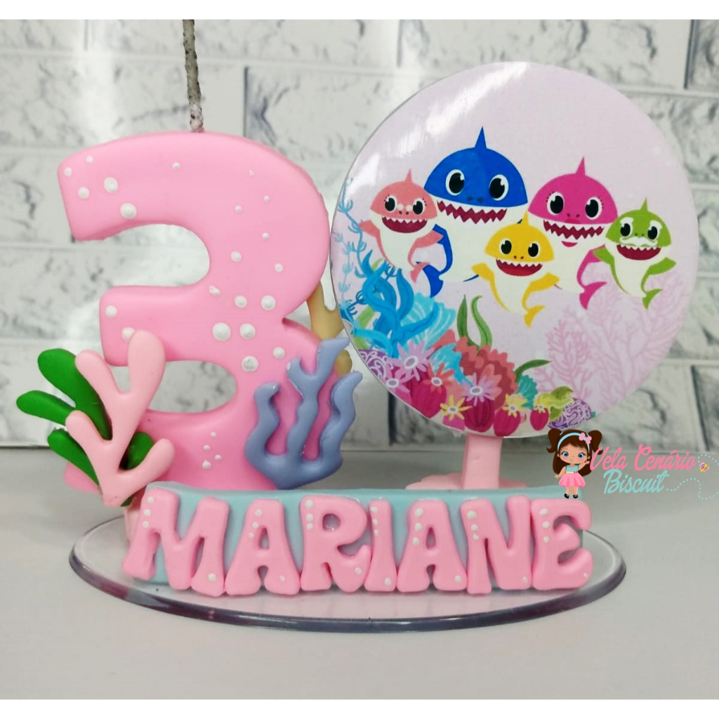 Vela de aniversário Baby Shark Menina Cenário biscuit 1 , 2 , 3 , 4 , 5 anos topo de bolo Cenário