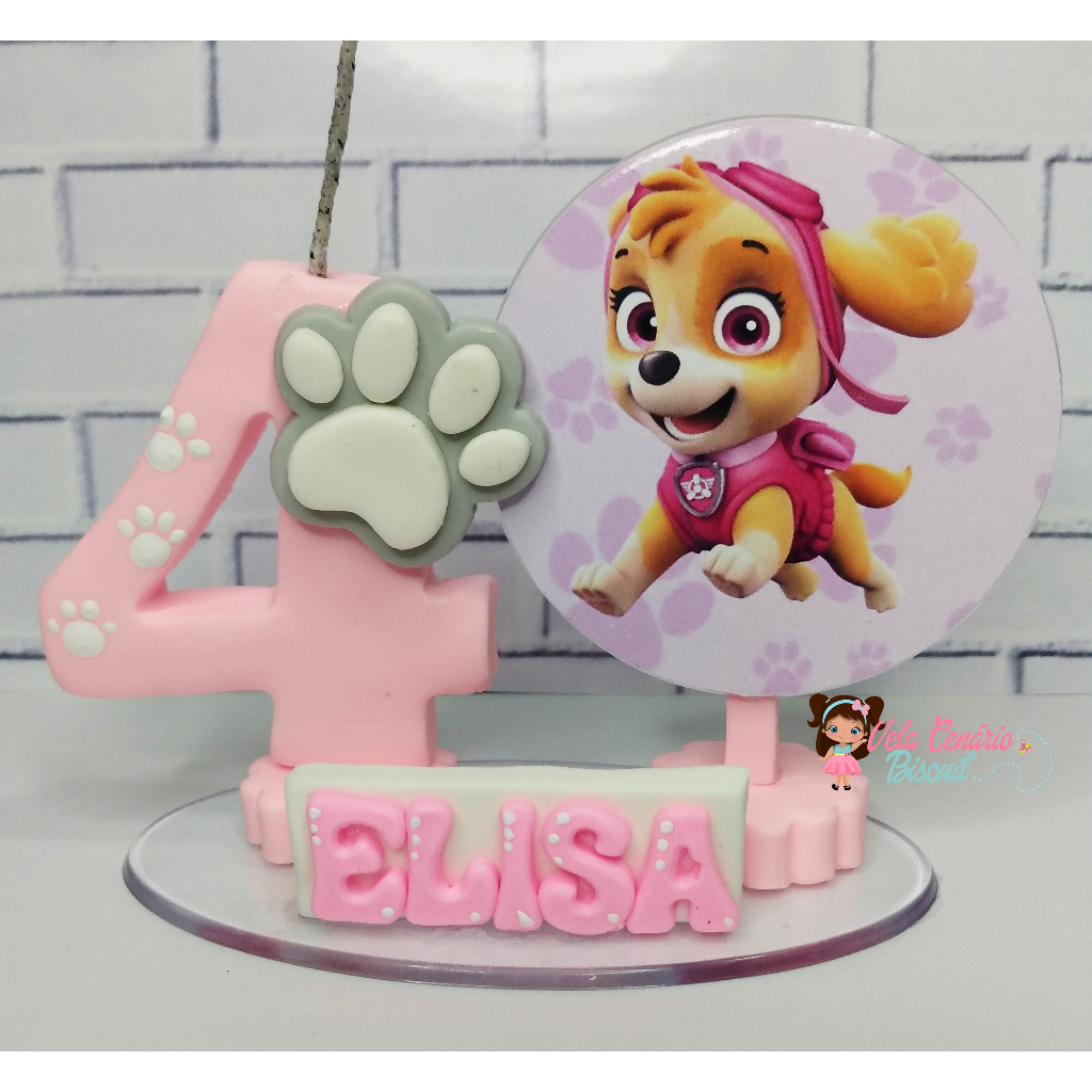 Vela de aniversário Patrulha Canina Menina Skye Cenário biscuit 1, 2, 3, 4 , 5 , 6 anos topo de bolo Cenário