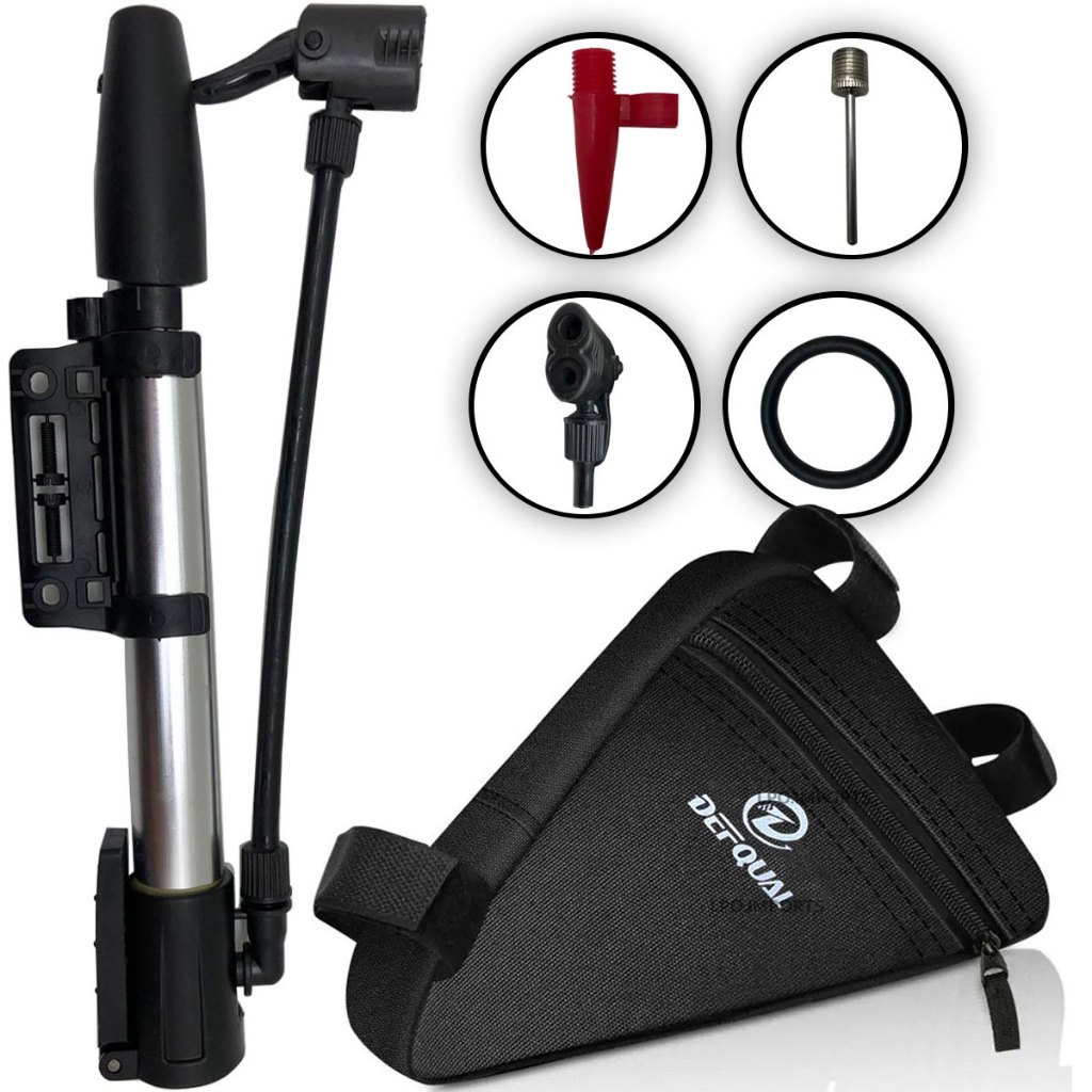 Bolsa Triangular De Quadro Para Bike Bicicleta + Bomba De Ar Enche Bola Presta Bico Fino E Grosso