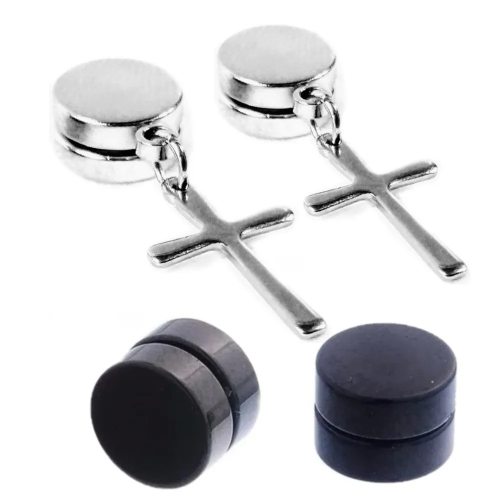 kit 2 pares brinco masculino feminino com imã magnetico redondo cruz crucifixo não precisar de furo em aço inox cor preto prateado