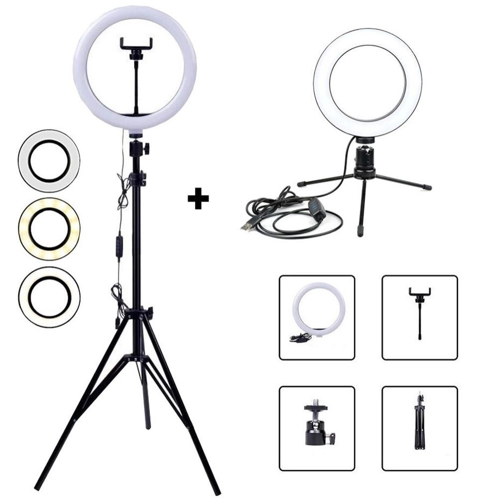 Kit Ring Light Grande 12 Polegadas com Tripe 2,10mt + Ring Light 8 Polegadas Pequeno de Mesa