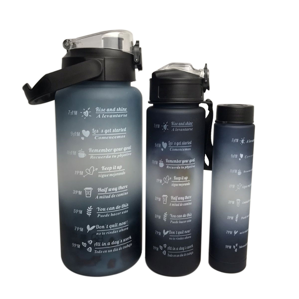 kit 3 Garrafa de Água com Adesivos 2D Motivacional em inglês/Português Squeeze Capacidade- 2000ml 900ml E 300ml Portatil Adesivos - com Frases Motivacionais com marcador. Garrafa de água de grande capacidade Não Vaza Ming