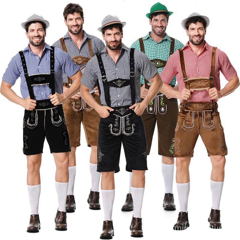 Nova chegada Alemão Munique Beer Festival Vestuário Oktoberfest trajes roupas Xadrez Casaco Brown Strap Calças Chapéu Três Peças Beer Suit Halloween