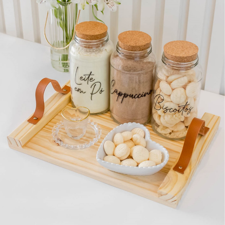 Bandeja Cantinho do Café | Pinus com Alça de Couro Sintético