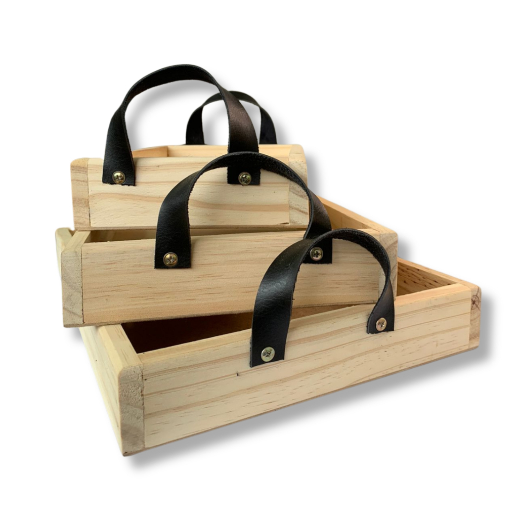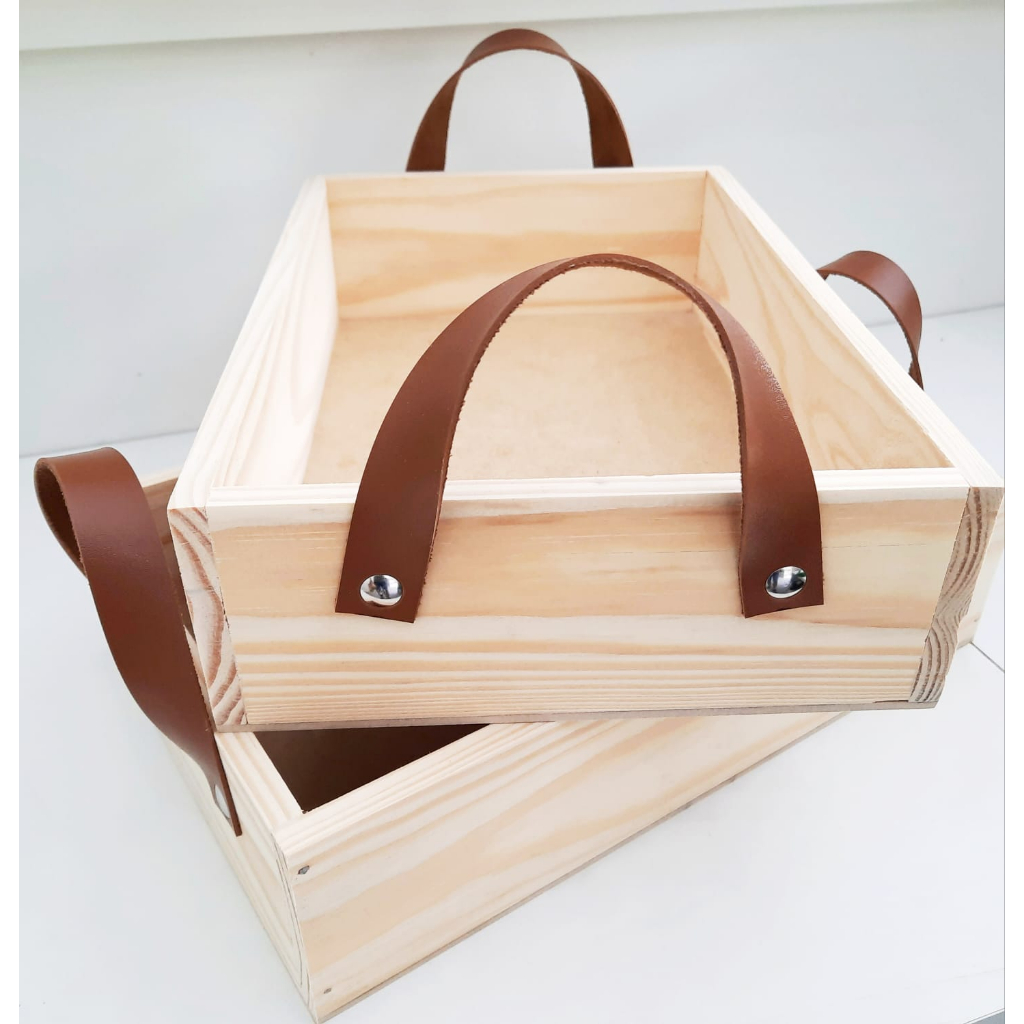 Bandeja alça de couro Pinus com alça de couro 7cm de altura