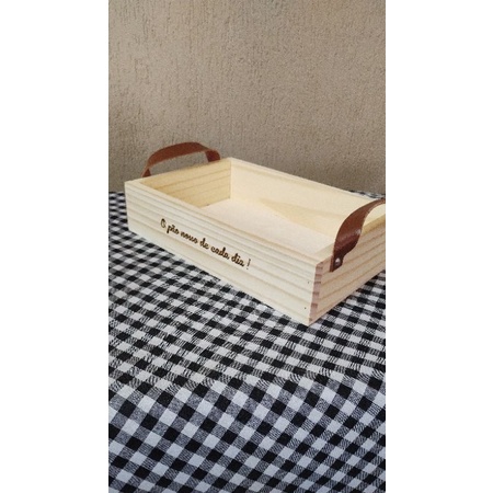 Bandeja, caixa de madeira com alça de couro, Personalize com sua frase, mesa posta, para servir pães, cesta de café da manhã