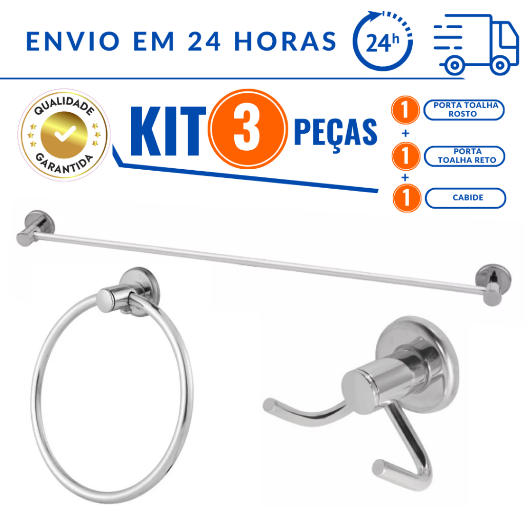 Kit 3 peças Acessórios Para Banheiro Porta toalha Reto 45cm Porta Argola e Cabide 2 Ganchos