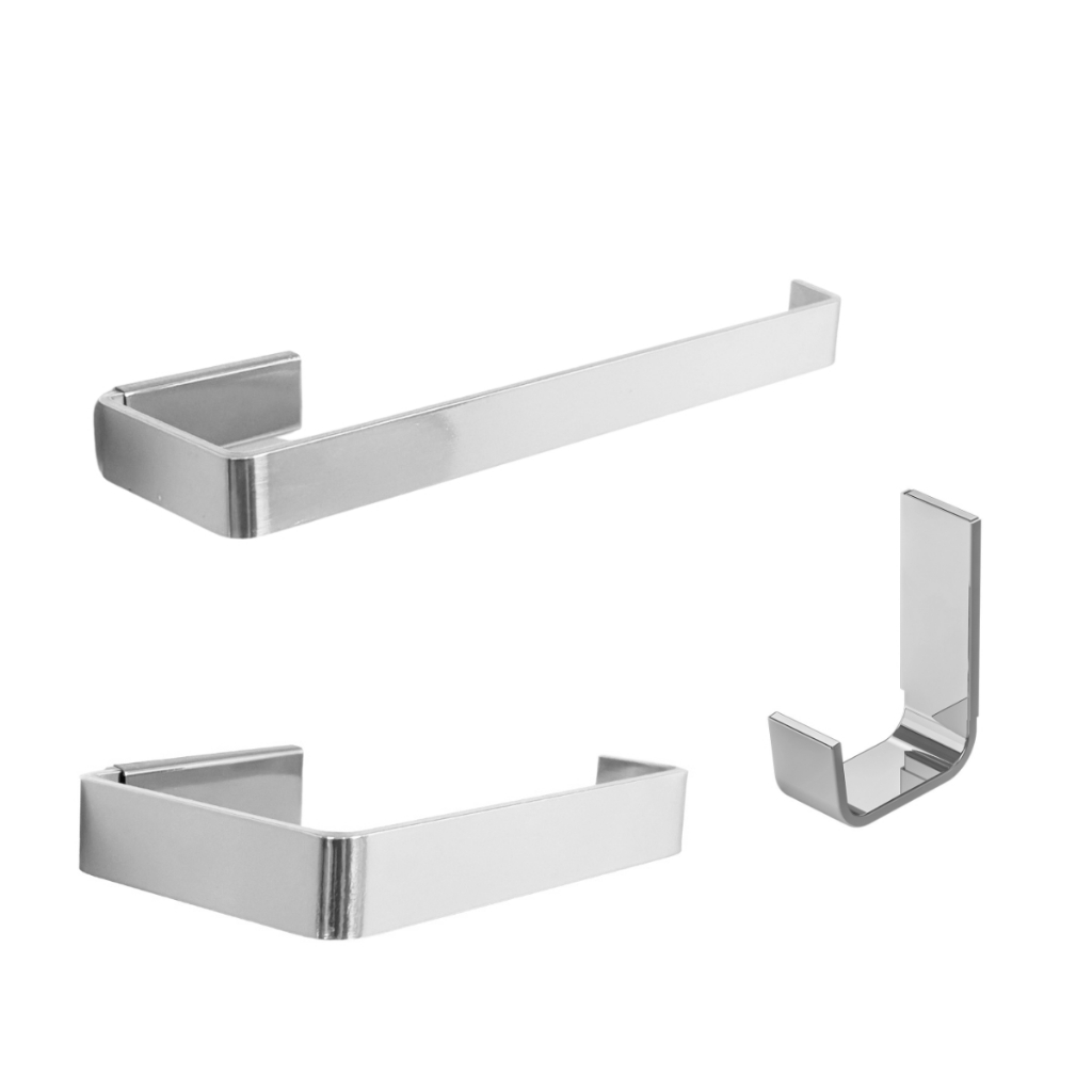 Kit Acessórios Para Banheiro 3 Peças Quadrado Cromado-1 Papeleira +1 Gancho+ 1 Porta Toalha de Rosto
