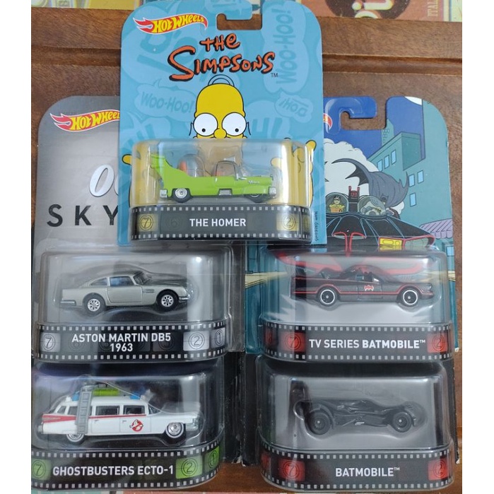 Hot Wheels Set com 5 miniaturas: * Batmobile * Tv Séries Batmobile * Aston Martin DB5 1963 * The Homer * Ghostbusters Ecto-1