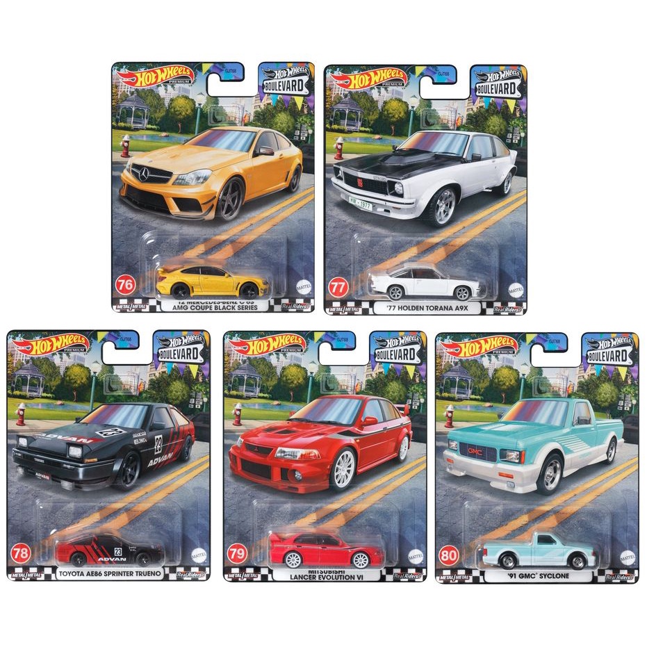 Hot Wheels 2023 Boulevard Premium ('77 Holden Torana A9X HKF12 , 12 Mercedes-Benz C63 AMG Coupe Black Series HKF23 , 91 GMC Cyclone HKF24 , Mitsubishi Lancer Evolução VI HKF26 , Toyota AE86 Sprinter Trueno HKF28) 1 : 64 Diecast Carro Modelo De Escala