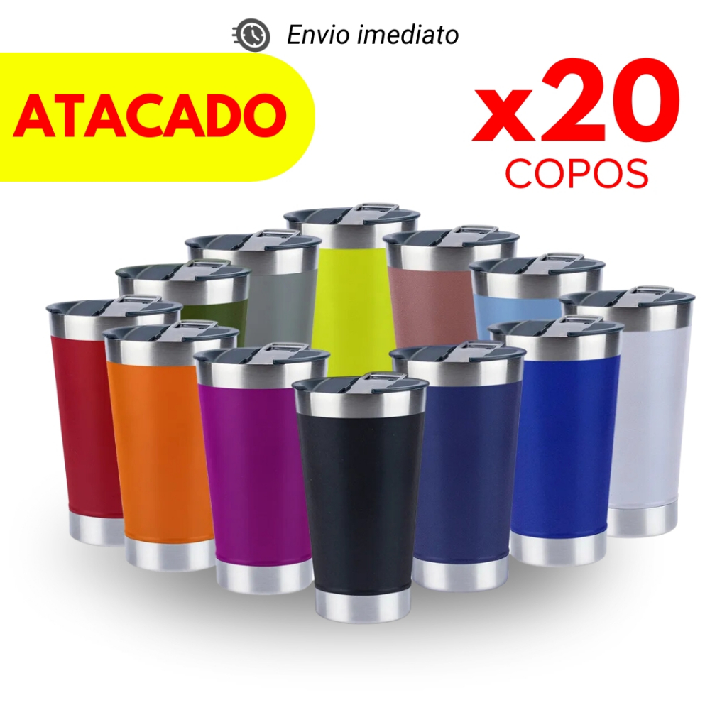 Kit 20 Copo Térmico 473ml Com Tampa e Abridor de Garrafas Copo Inox Atacado