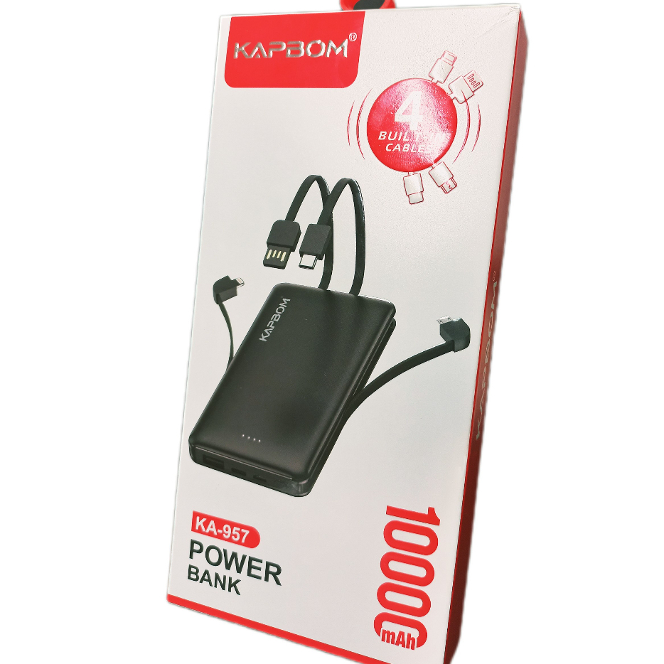Carregador Portátil Power Bank 10000 mAh Kapbom KA-957 Original Com 4 Cabos embutidos Lightning, Tipo-C, Micro USB e para próprio carregamento