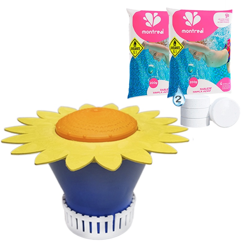Dosador de Cloro Clorador de Pastilha Flutuante Para Piscina Girassol Ate 600g + 2 Pastilhas Cloro