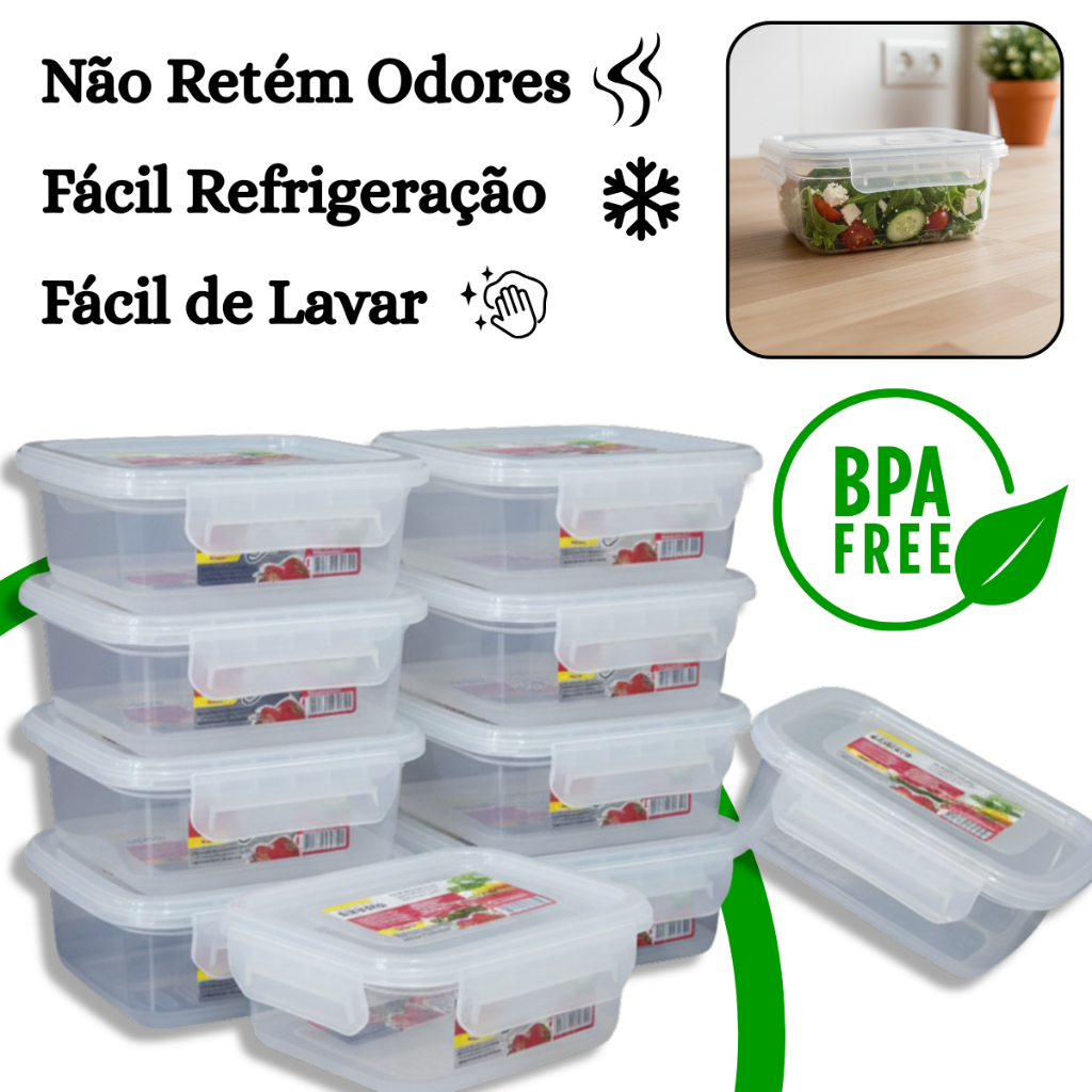 Kit 10 Pote Marmita Hermético 400ml Retangular Tampa com Trava Livre de BPA