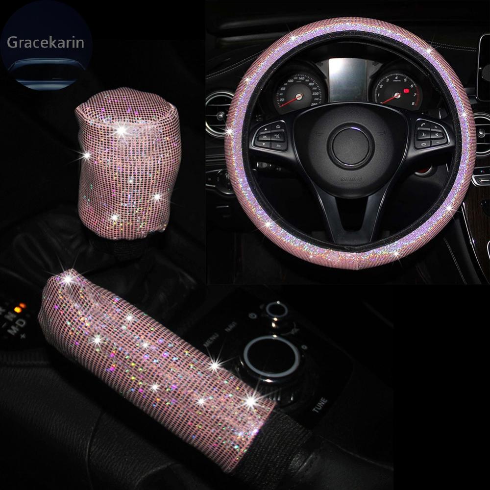 3PCS-Tampa Do Volante Carro Glitter Bling Capa Freio De Mão Rosa US