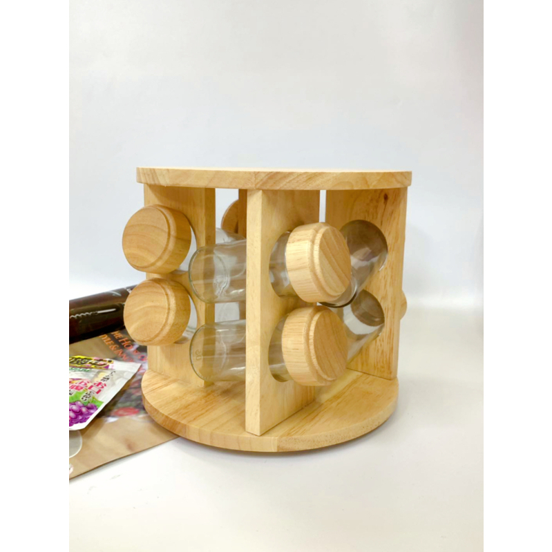 Porta Tempero Condimentos De Madeira Com Potes de Vidro Quantidade 8 Potes + Suporte Giratório