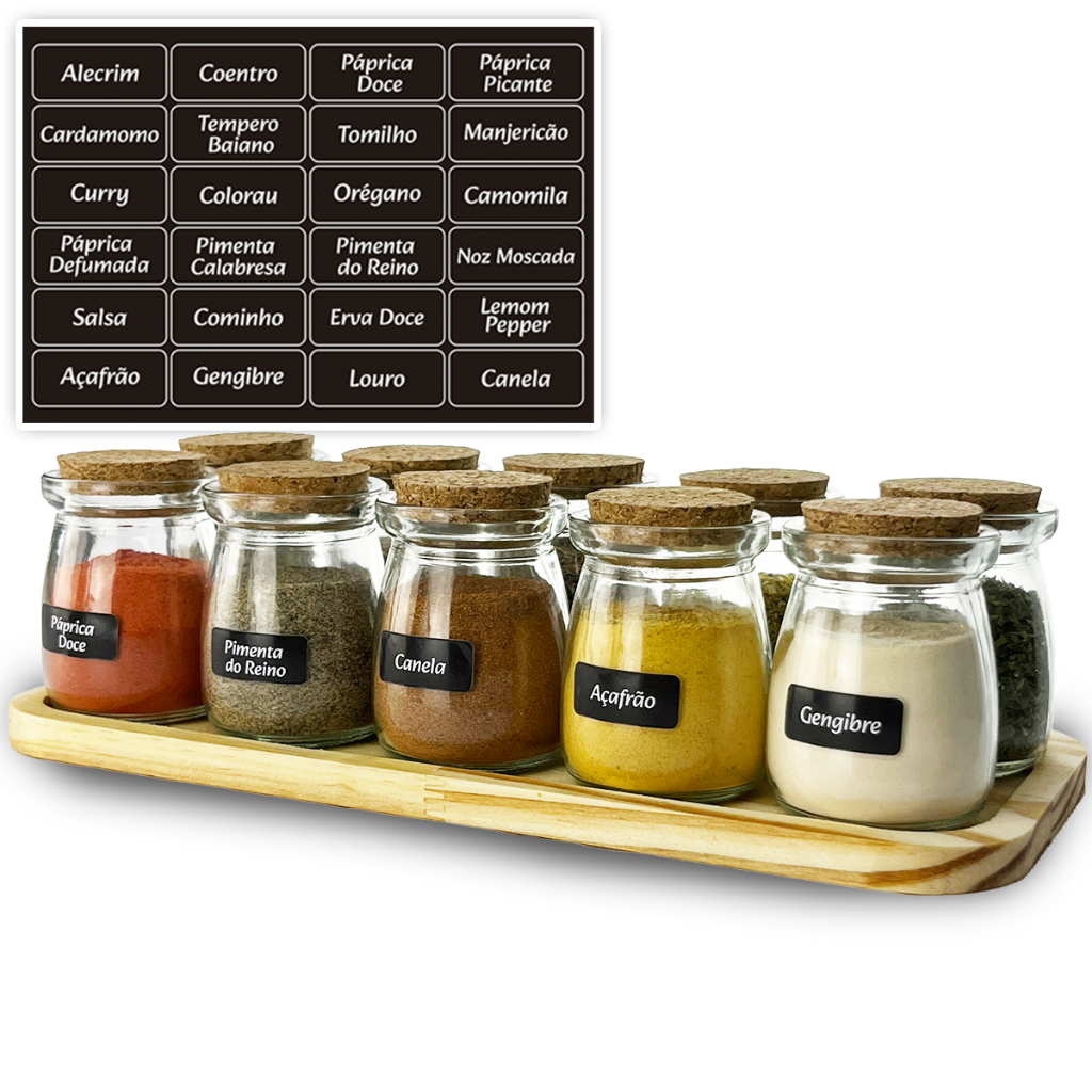 Porta Tempero com 10 Potes Bandeja Organizadora de Madeira Ágora em Madeira Estilo Leiteira 100ml