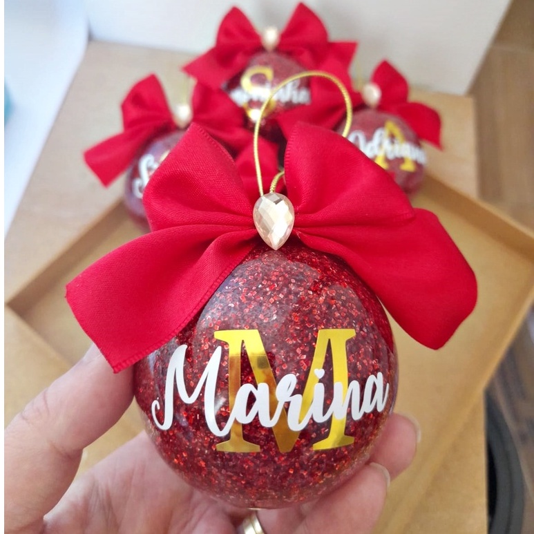 Bola de Natal com glitter e nome - 4 , 5 ,6, 7 ,10 ,12 unidades