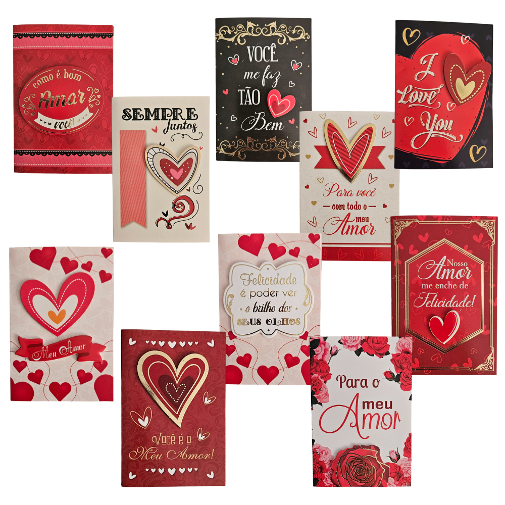 Kit 10 Cartões de Felicitações Amor Romântico Dia dos Namorados 7,5 x 11,0cm com Envelope