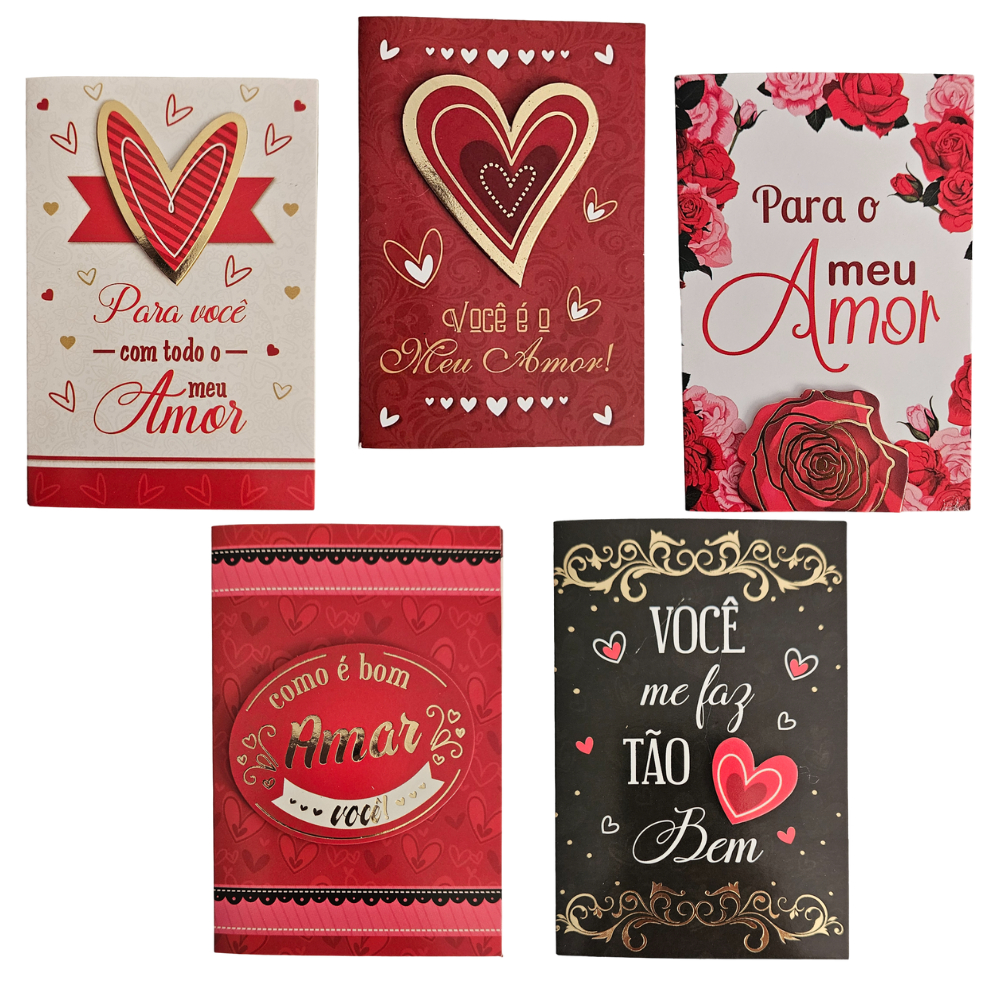 Kit 5 Cartões de Felicitações Amor Romântico Dia dos Namorados 7,5x11,0cm com Envelope