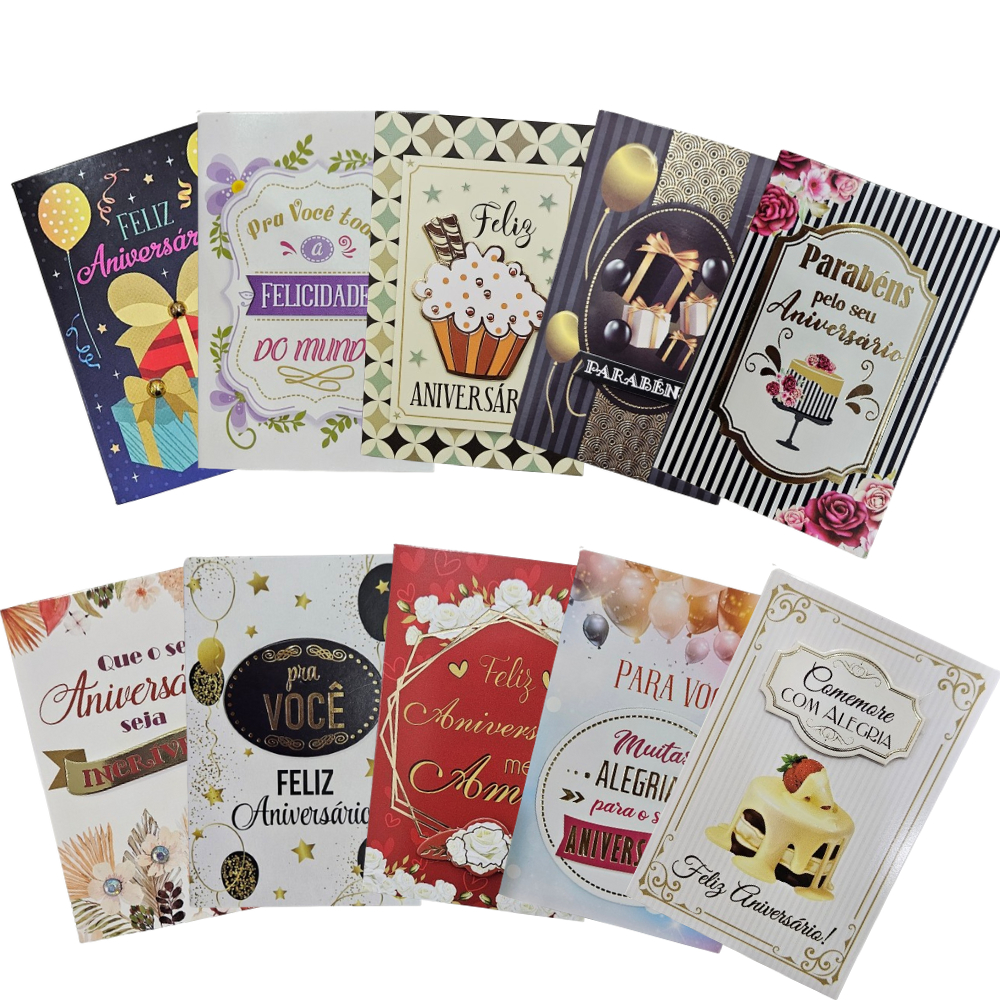 Kit 10 Cartões de Felicitações Aniversário 7,5 x 11,0cm, com Envelope