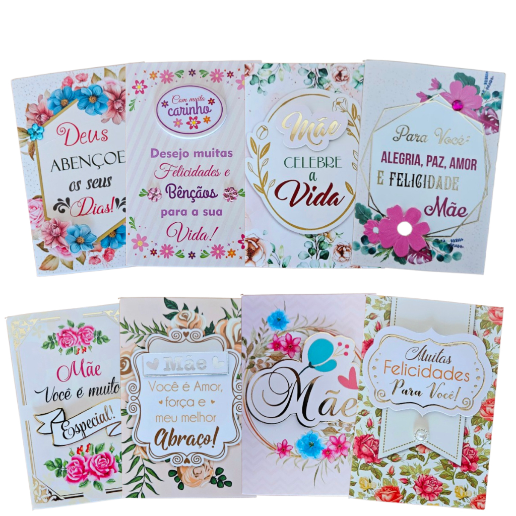 Kit 8 Cartões de Felicitações Mãe / Dias das Mães 7,5 x 11,0cm com Envelope