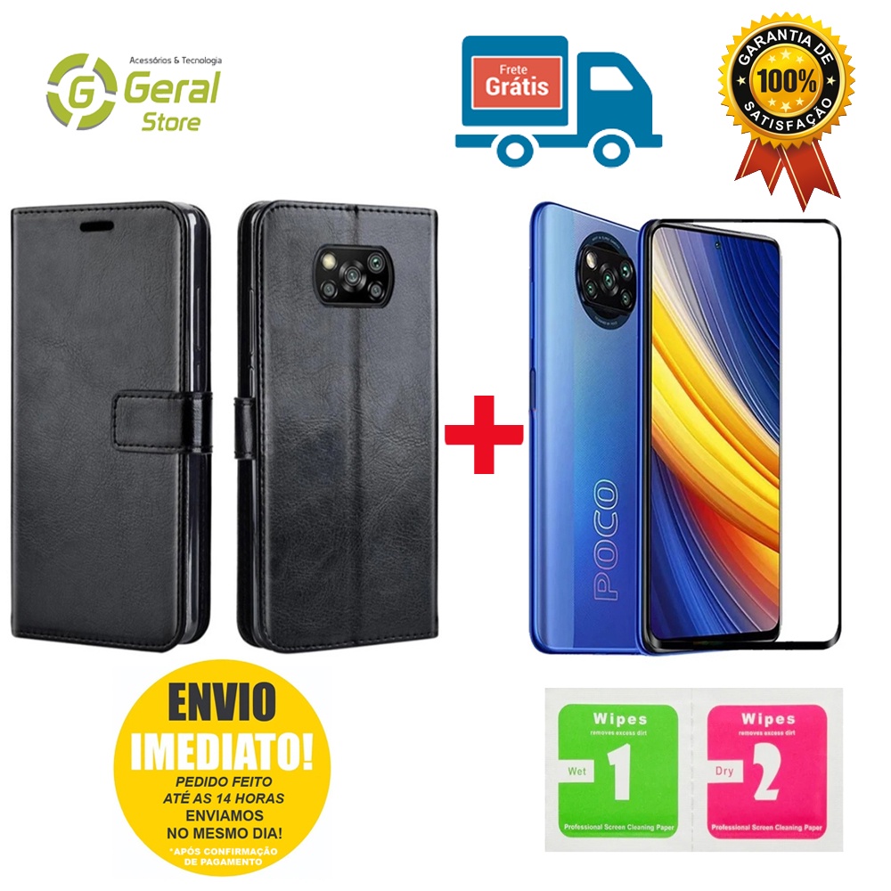 Combo Capa Carteira Xiaomi Poco X3 / Poco X3 Pró + Pelicula 3D Cores diversas