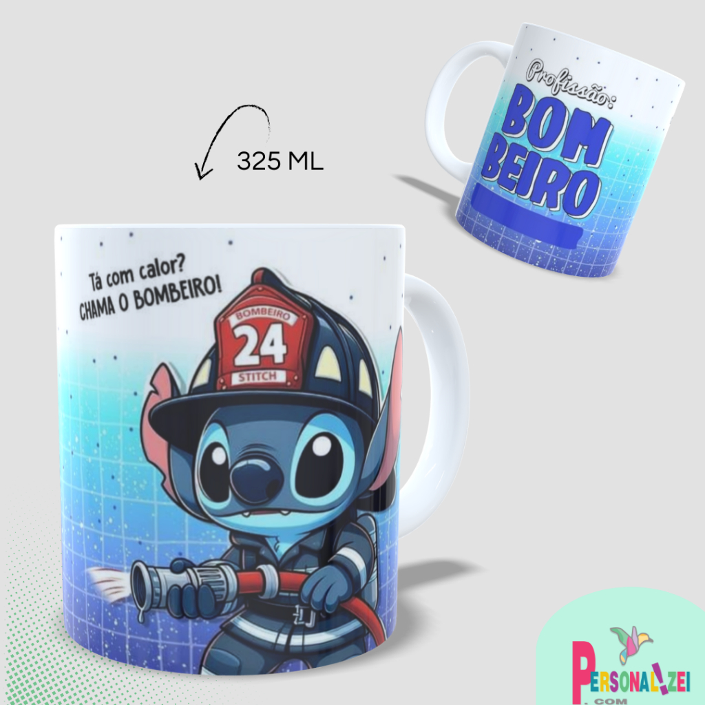 Caneca Personalizada Profissões Stitch Bombeiro Xícara Personalizada Stitch Caneca para Café