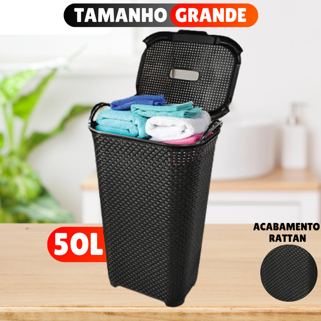 Cesto de Roupas Basculado Rattan 50 Litros Grande C/ Tampa E Alça Para Organizador Lavanderia