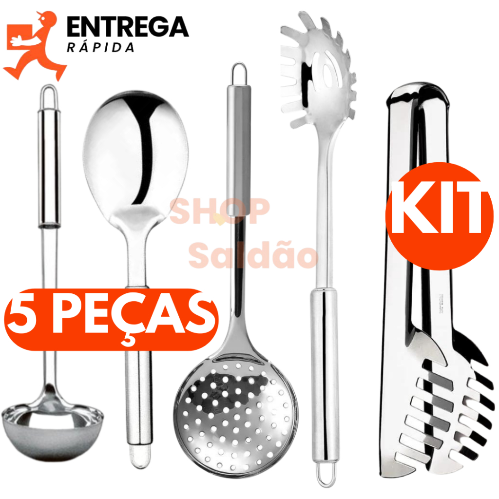 Kit 05 Utensílios de Cozinha em Aço Inox Completo e Moderno Inclui Escumadeira Pegador de Massa Pinça Concha Pegador de Massa Reto Colher de Arroz