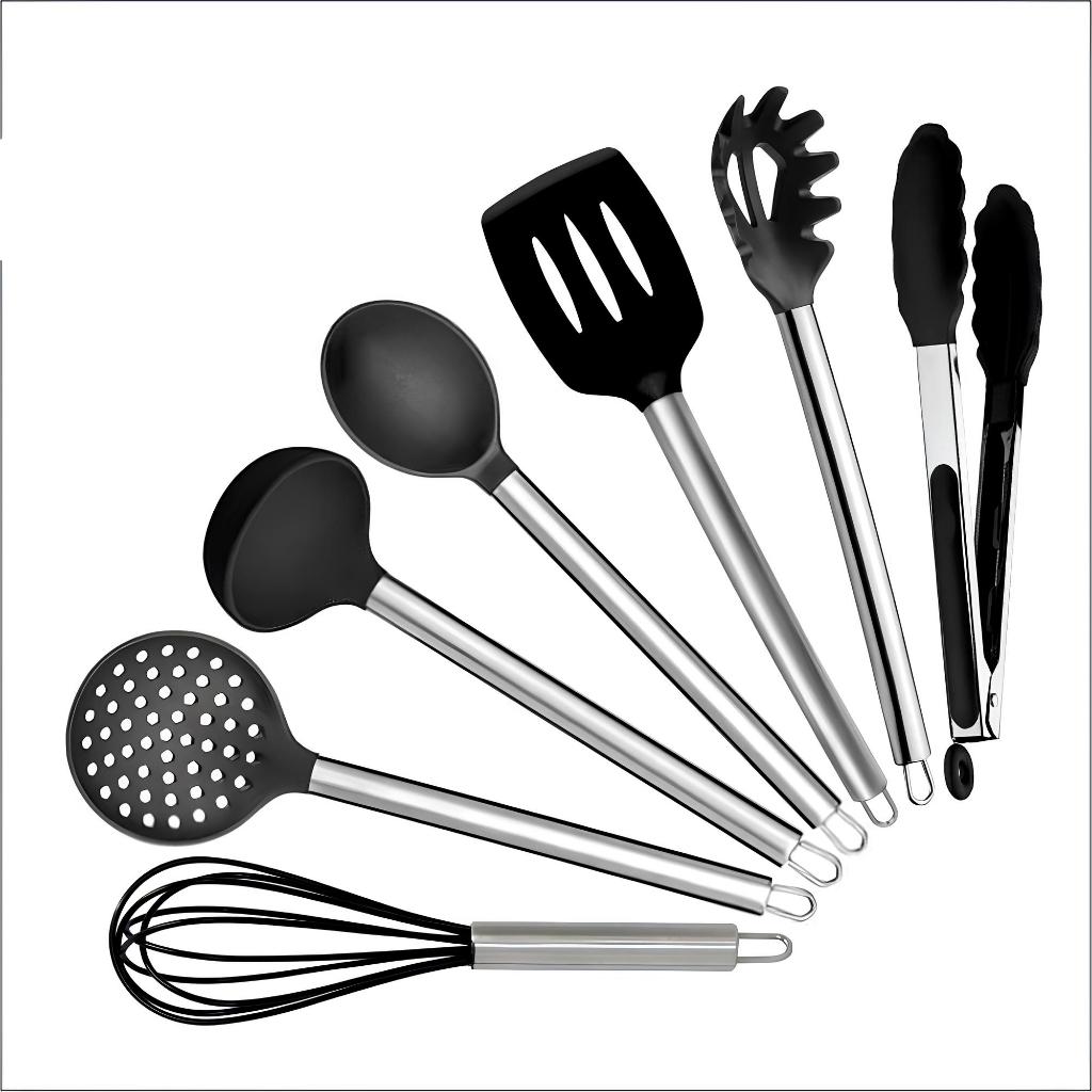 Jogo de Utensílios em Silicone Preto com Suporte Inox 7 Peças Kit Cozinha Moderno Versátil Tendência Alta Qualidade