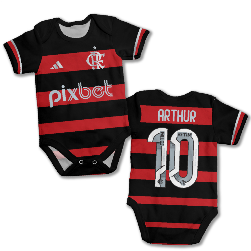 Body bebê personalizado com nome Flamengo várias estampas vermelho, branco, rosa