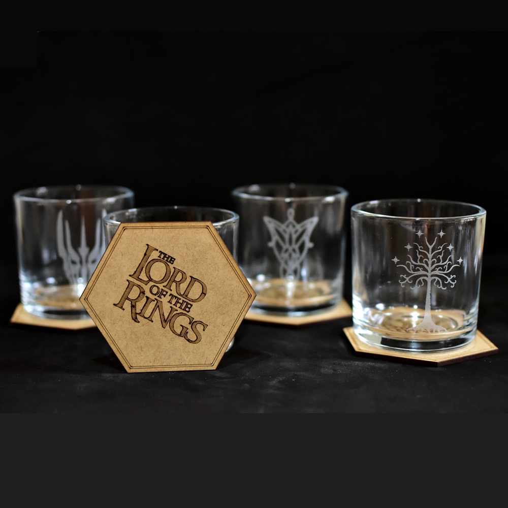 Jogo De Copos Senhor dos Aneis Whisky Com Base Madeira Gravação a Laser Kit 4un.